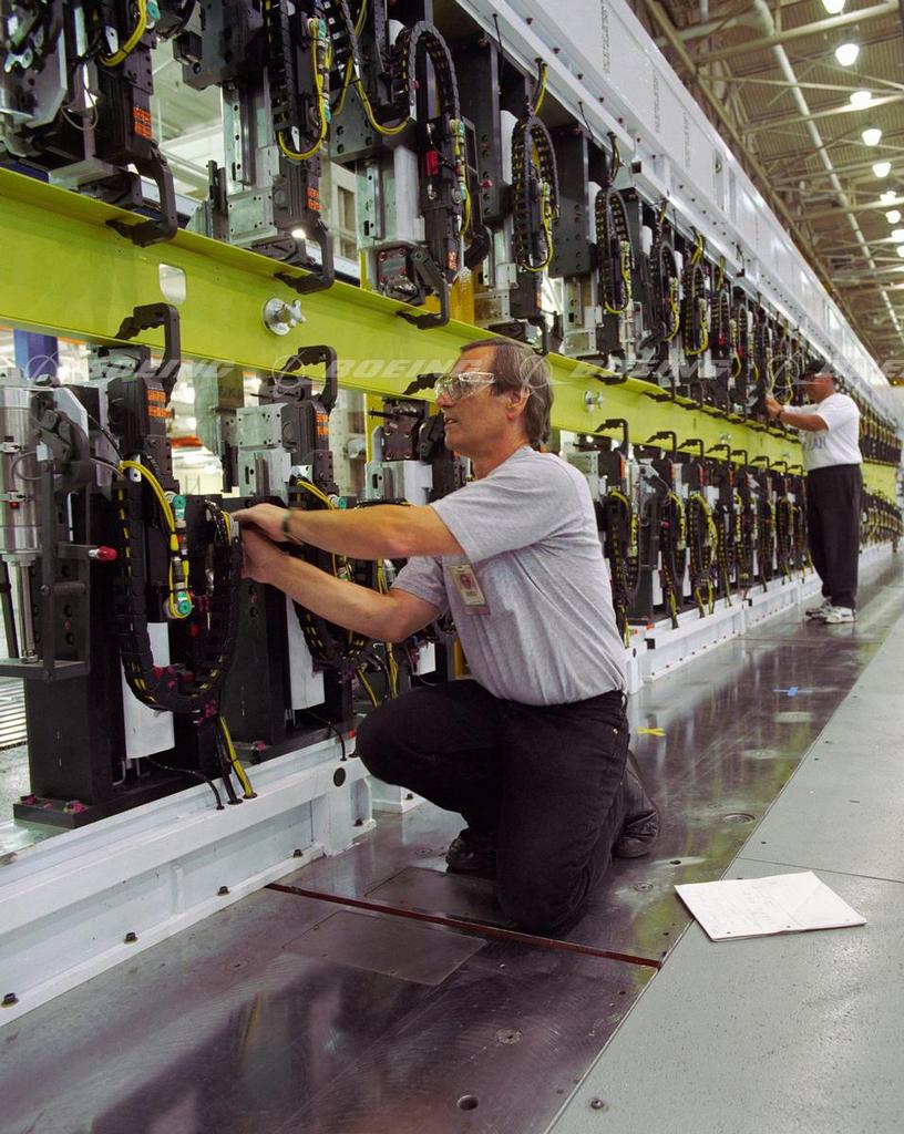 September 19, 1997 - Roger Trudeau, left and Nate Hale, mechanics at the Boeing Wing Responsibility Center in Renton, WA, lock the clamps that hold the first Boeing 757-300 front, left wing spar in place in the state-of-the-art Automated Spar Assembly tool (ASAT). The wing spar - 63 feet in length - serves as an internal support structure and is the first major part of the 757-300 to be assembled. The first delivery of the 757-300 twinjet, a derivative of the Boeing 757-200, is scheduled for 1999.