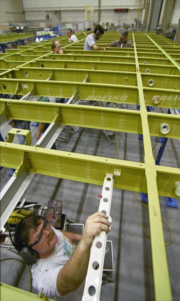 The floor beams for a 767-400ER's forward fuselage Section 43 are placed into tooling.