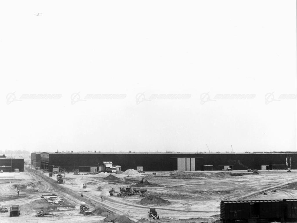 A biplane is faintly visible in the sky as it flies over the construction site for the new Long Beach Aircraft Plant.