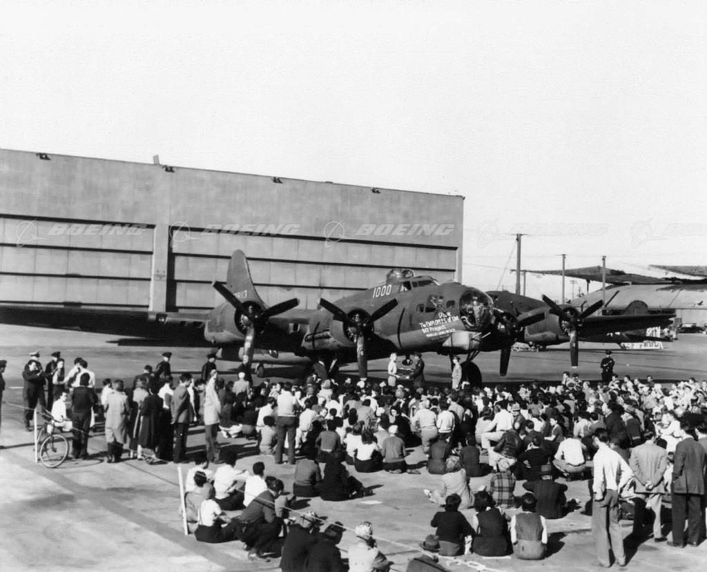 In April 1944, the workers of the Long Beach Douglas plant learned that the 1,000th B-17G Flying Fortress produced at the plant successfully completed many missions over Germany.