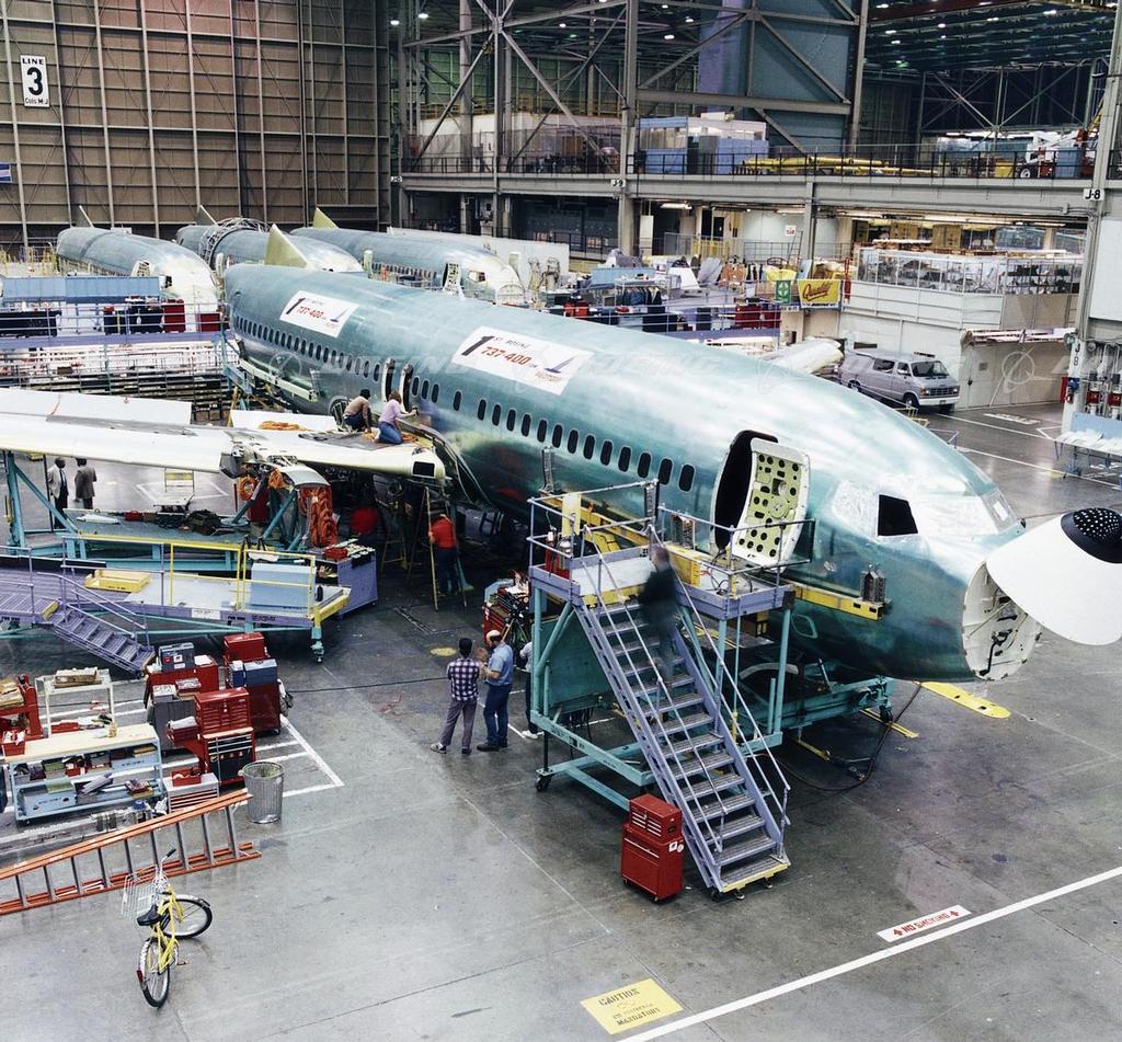 Except for length, the 737-400 is virtually identical to the 737-300, allowing all 737s to be efficiently assembled on the same production line. In 2002, 737 manufacturing became even more efficient by implementing a moving line system of manufacturing where aircraft are towed continuously through final assembly, replacing the station to station method of assembly pictured here.