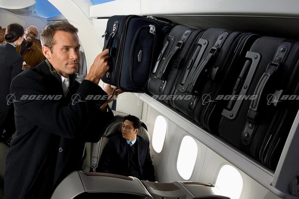 The 787 Dreamliner overhead bins will be the largest in the industry. They are designed around the variety of roll-aboard bags that passengers typically carry. As a result, every passenger will be able to place a bag in the bin above.