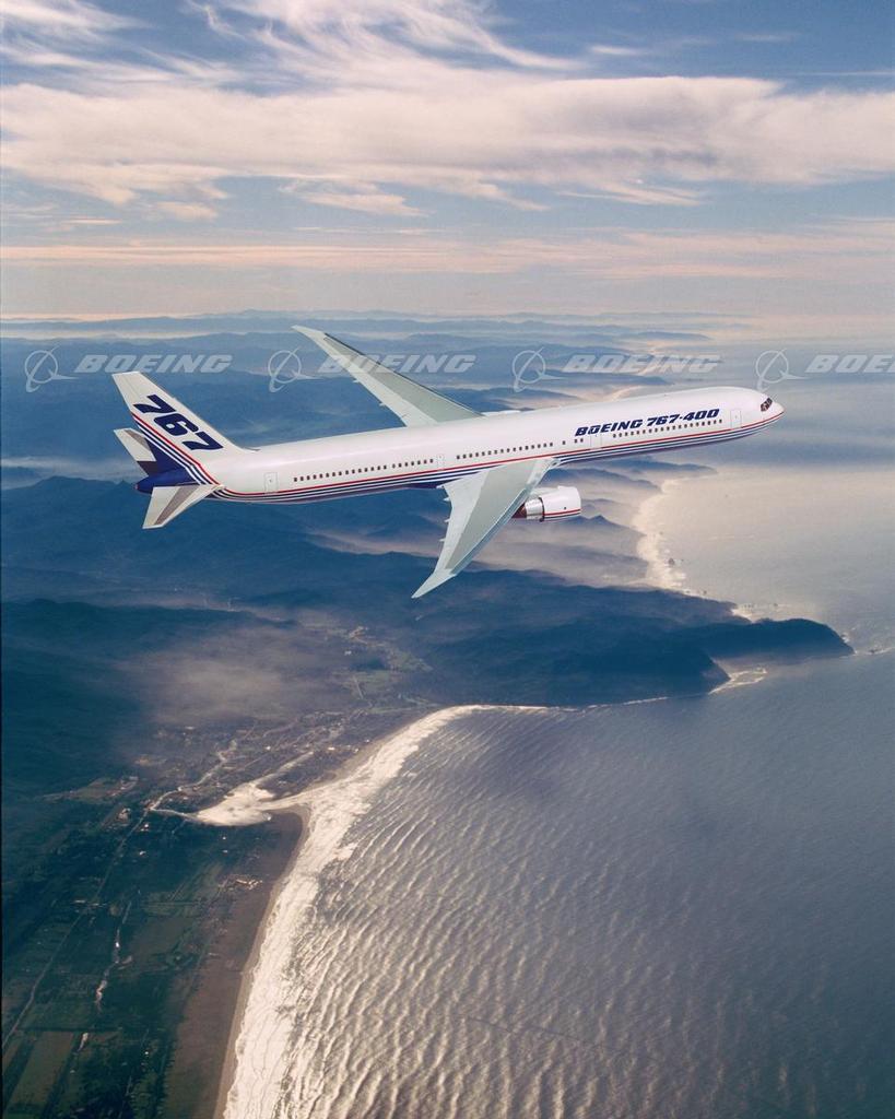 The newest Boeing 767 derivative, launched in April 1997, cruises over a coastline in this artist's rendering. Compared with the 767-300, the 767-400ER (extended range) features a longer fuselage, additional wing span and increased takeoff-weight capability. The 767-400ER will incorporate a new interior and an upgraded flight deck that can be programmed to look like the information displays in the existing 767 fleet.
