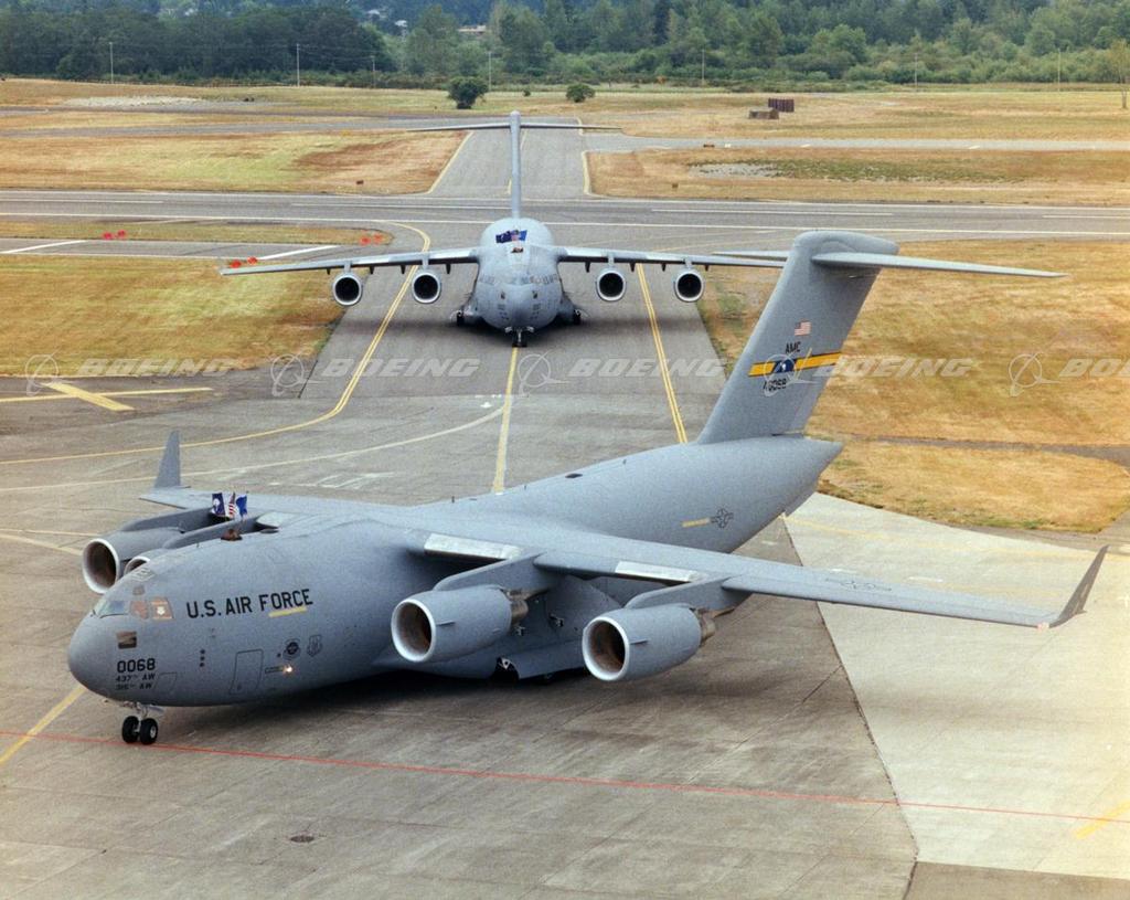 Two McDonnell Douglas C-17 Globemaster IIIs taxi in at McChord Air Force Base, WA, during an Air Force airdrop competition. The C-17s were from the 437th Airlift Wing at Charleston AFB, SC.