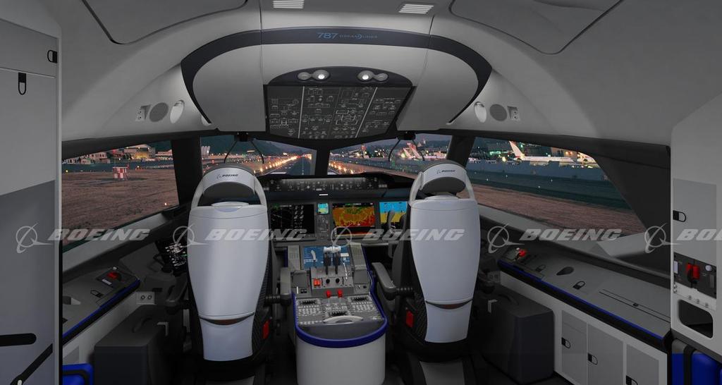 The new Boeing 787 Dreamliner flight deck introduces innovative new technologies to help pilots while maintaining commonality with the popular Boeing 777 Worldliner. Commonality with the 777 greatly reduces the training pilots of other Boeing airplane models will need to become qualified as 787 pilots. The 787 features the industry's largest display screens, with five monitors that measure 15 inches on the diagonal. They provide more than twice the display space as the 777, giving pilots more information in easier-to-read formats. Other standard euipment on the 787 flight deck includes dual heads-up displays, dual electronic flight bags, traffic-alert and collision-avoidance system, electronic checklists, full-route vertical situation displays, large-format map, and dual enhanced ground-proximity warning systems.