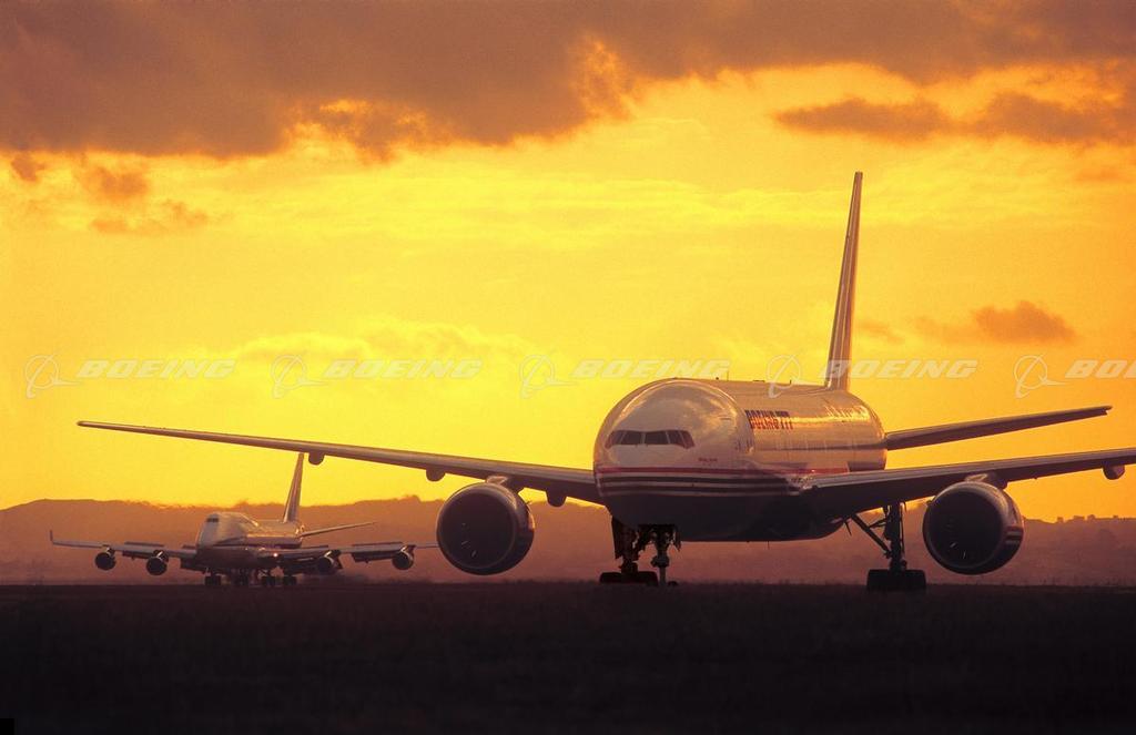 777 with Passenger Boarding Stairs Silhoetted at Sunset