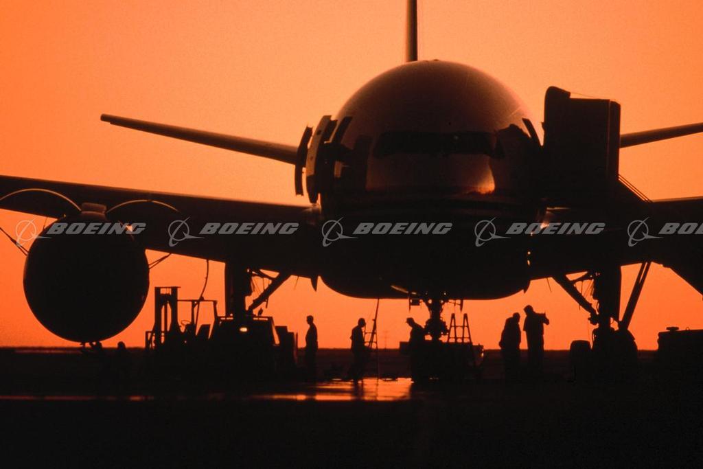 777 with Passenger Boarding Stairs Silhoetted at Sunset
