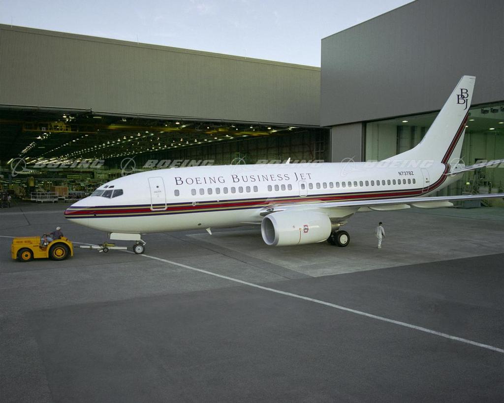 August 11, 1998 -- With its distinctive new livery sparkling under the evening skies, the first Boeing Business Jet rolls out of the paint hangar in Renton, Wash. The ultra long-range executive jet is a special derivative of the Next-Generation 737-700. In the Boeing Business Jet, or BBJ, good design has transformed 10% more exterior space into 280% more interior space. The spacious 807-square-foot cabin has ample room to walk around, work, get a good night's sleep, or even take a shower.