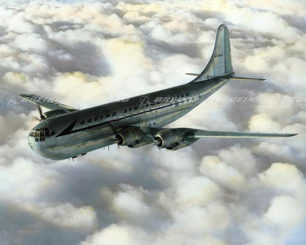 The Boeing 377 Stratocruiser of 1947 provided seating for 55 passengers, or 100 passengers with its sleeping deleated. Stratocruisers were the last piston-powered airliners built by Boeing.