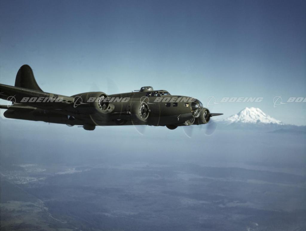 B-17E Flying Fortress Flies Past Mt. Rainier, Air to Air