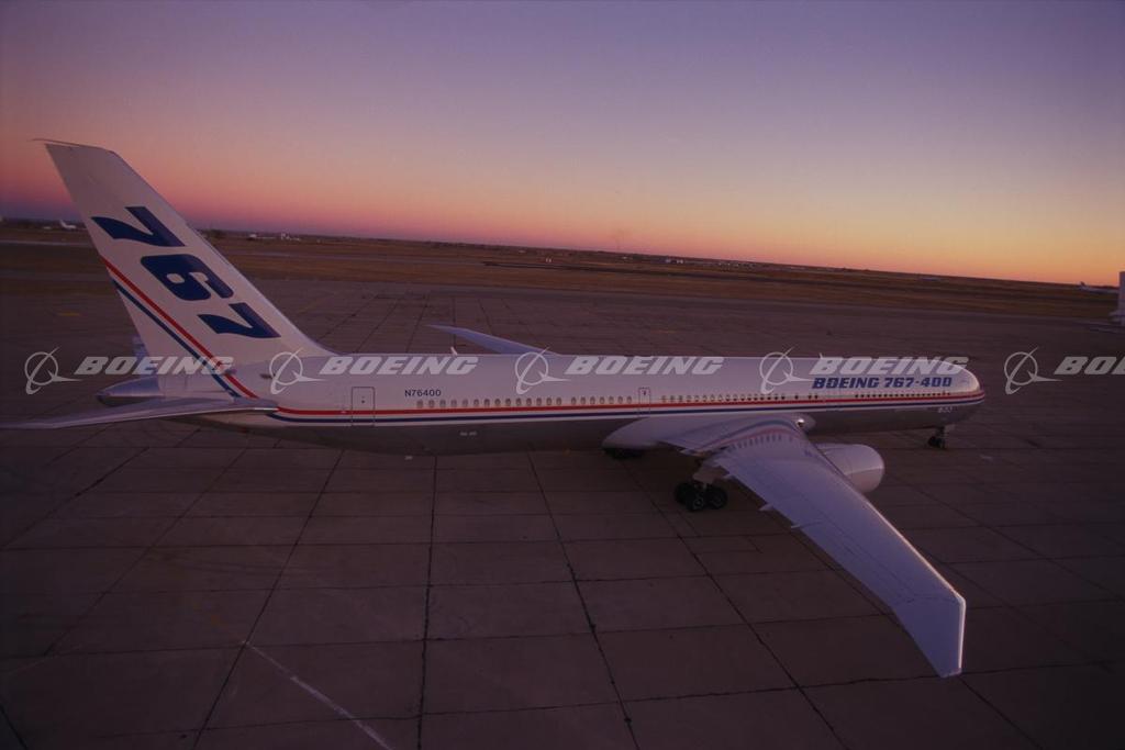 The 767-400ER features new, highly back-swept (raked) wing-tip extensions. The newest members of the 757/767 family offer airlines increased seating capacity, lower costs per seat-mile, and greater market flexibility. Sized between the 767-300 and the 777-200, the 767-400ER will carry 245 passengers in a typical three-class configuration, and 304 passengers in a typical two-class configuration. The 201-foot-long jetliner features an upgraded flight deck with six large displays for flight and navigation data, and a new passenger cabin designed with curved ceilings and side walls inspired by the award-winning 777 interior.