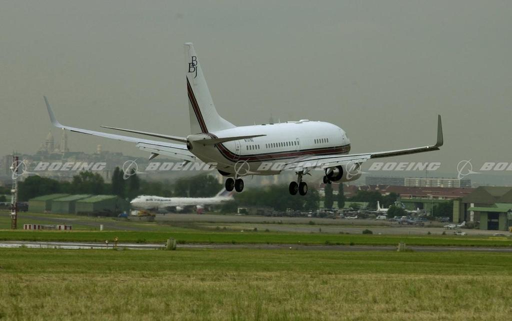 A Boeing-owned Boeing Business Jet (BBJ) arrives at Le Bourget Airport for the opening of this year’s Paris Air Show, which runs from June 16 - 24. The winglet-equipped BBJ will be open to customers and members of the media for the first time at the show.Boeing Business Jets is a joint venture with General Electric launched in July 1996 to respond to market demand for a larger, more capable business airplane that can fly more than 6,000 nautical miles (11,110 kilometers). Since the program’s inception, there have been 56 “green” (no paint or interior) BBJs delivered, and 32 are in service.