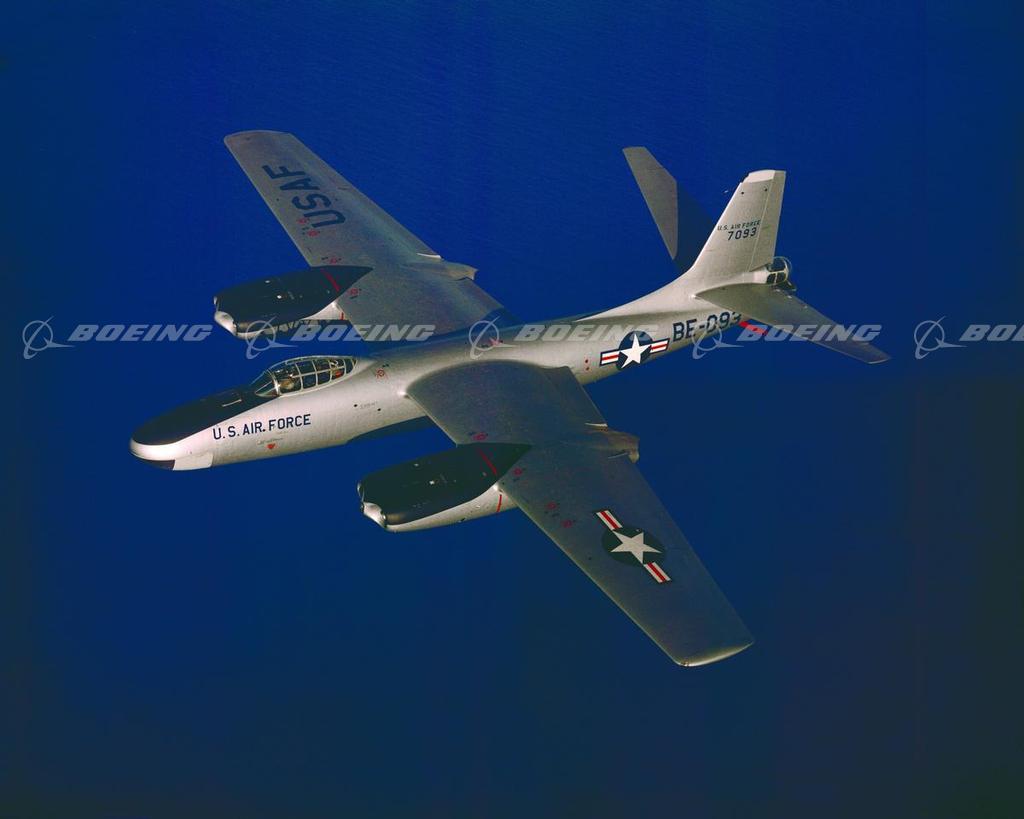 North American Aviation’s straight-wing B-45 Tornado, designed during 1944 and 1945, first flew in February 1947. It was the first jet bomber in service with the Air Force and the first four-jet airplane to fly in the United States. Versions included the longer-range B-45C with wingtip tanks and the photoreconnaissance version, the RB-45C. Rated as a light bomber by modern-day standards, it was the first four-jet aircraft to drop an atom bomb and the first to be refueled in midair. It had a wingspan of 89 feet, and it was 75 feet 11 inches long.