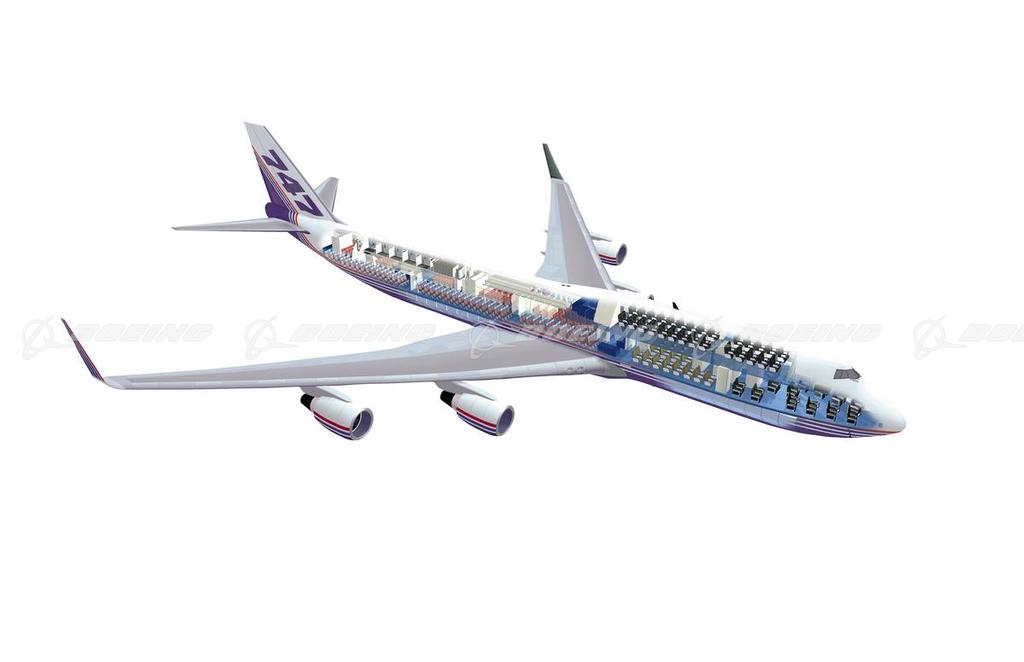 With seating for more than 520 passengers, the Boeing 747X Stretch would be the world's largest 747. A typical interior arrangement includes: 28 first-class seats in the Zone A first-class forward section; 56 business seats on the famous upper deck and 42 business-class seats on the main deck; and economy seating for 378 to 396 passengers. Also depicted in this cutaway view is the innovative overhead space above the passenger cabin's aft end. This area could be used for crew rest, galley-cart stowage or passenger sleeping berths or privacy space. The high capacity of the 747X Stretch is accomplished by stretching the airplane's fuselage 31.5 feet (9.6) meters) more than today's 747-400. Boeing is developing the 747X family of airplanes to support the 747-and-larger market segment. When combined with the Longer-Range 777s, customers have the solutions needed to support the dynamic long-range market as a whole.