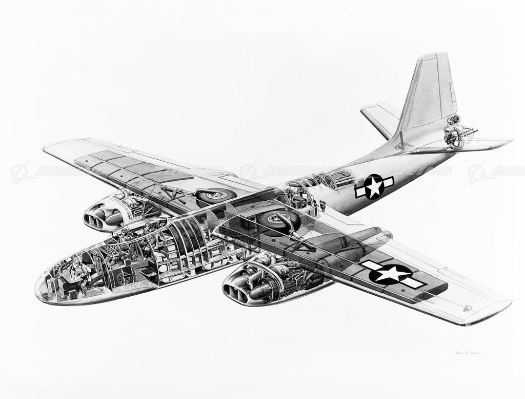 North American Aviation's straight-wing B-45 Tornado, designed during 1944 and 1945, first flew in February 1947. It was the first jet bomber in service with the Air Force and the first four-jet airplane to fly in the United States. Versions included the longer-range B-45C with wingtip tanks and the photoreconnaissance version, the RB-45C. Rated as a light bomber by modern-day standards, it was the first four-jet aircraft to drop an atom bomb and the first to be refueled in midair. It had a wingspan of 89 feet, and it was 75 feet 11 inches long.