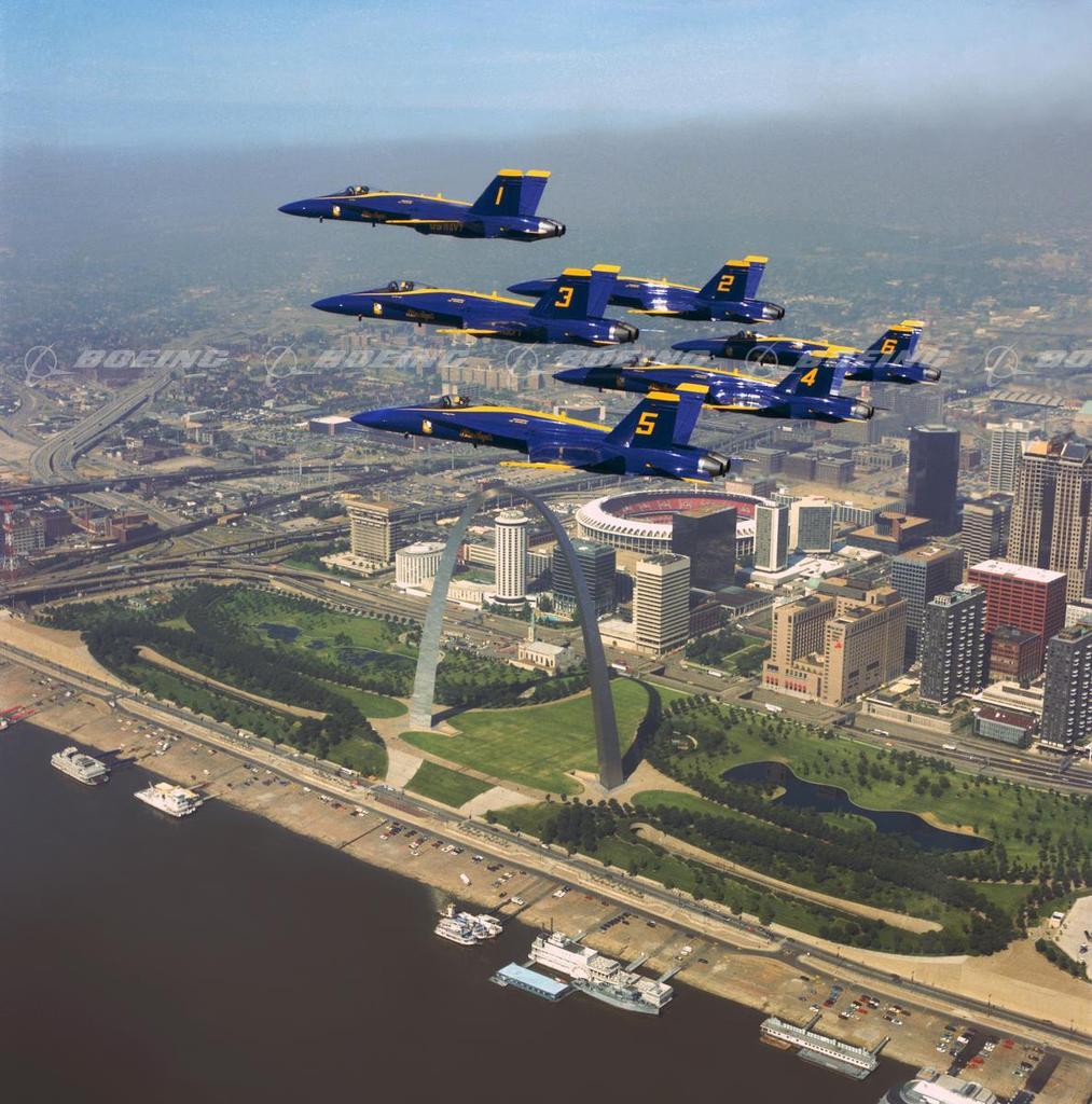 Blue Angels F/A-18A Hornets Perform a Delta Pass Over Boeing in St. Louis