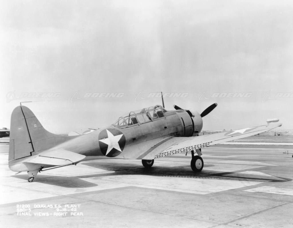 The SBD Dauntless was a two-place, low-wing Navy scout bomber, powered by a single Wright R1820, 1200-horsepower engine. The Dauntless became a mainstay of the Navy's air fleet in the Pacific, with the lowest loss ratio of any U.S. carrier aircraft. A total of 5396 SBDs was delivered between the first delivery in 1940 and the end of produciton in 1944.