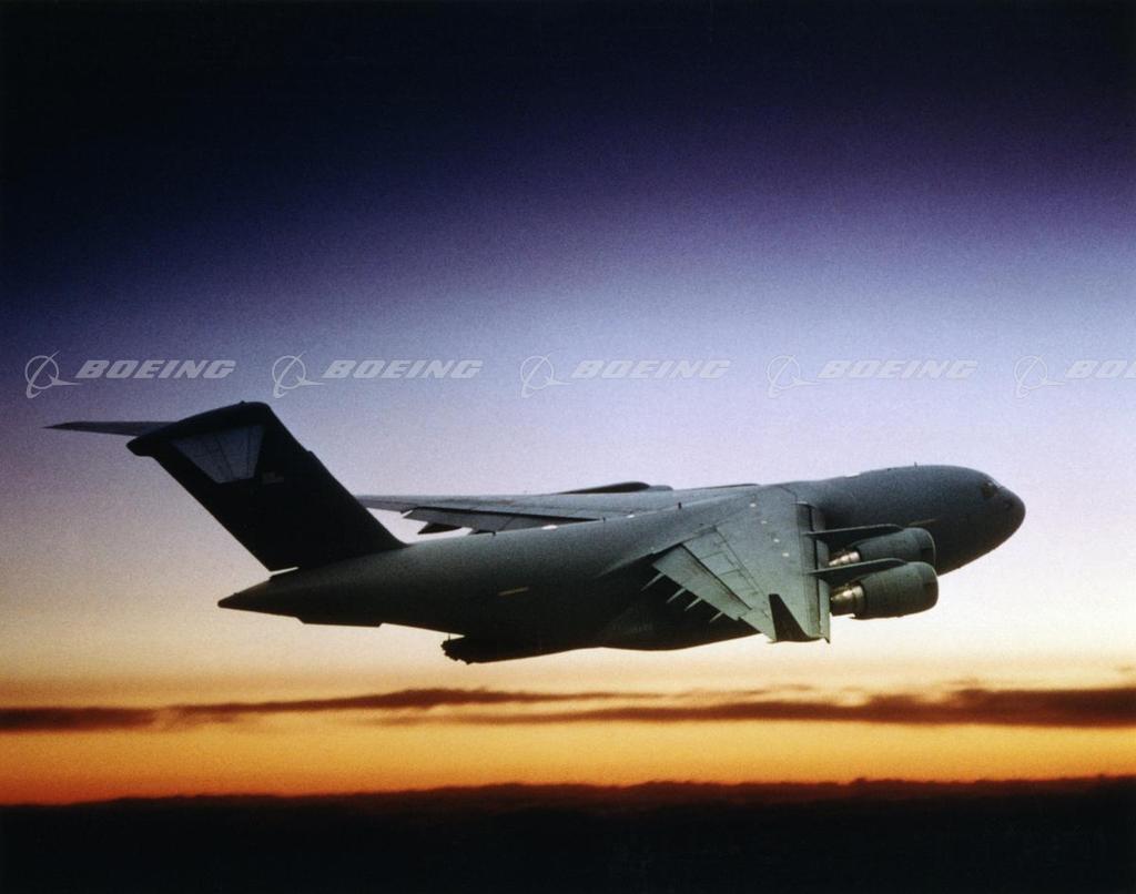 The Boeing C-17 Globemaster III is designed to fulfill military and humanitarian airlift needs well into the 21st century. A high-wing, four-engine, T-tailed aircraft with a rear-loading ramp, the C-17 can carry large combat equipment and troops or humanitarian aid across international distances directly to small austere airfields anywhere in the world. With a payload of 160,000 pounds, the C-17 can take off from a 7,600-foot airfield, fly 2,400 nautical miles, and land on a small, austere airfield in 3,000 feet or less. The C-17 is equipped with an externally blown flap system that allows a steep, low-speed final approach and low-landing speeds for routine short-field landings.
