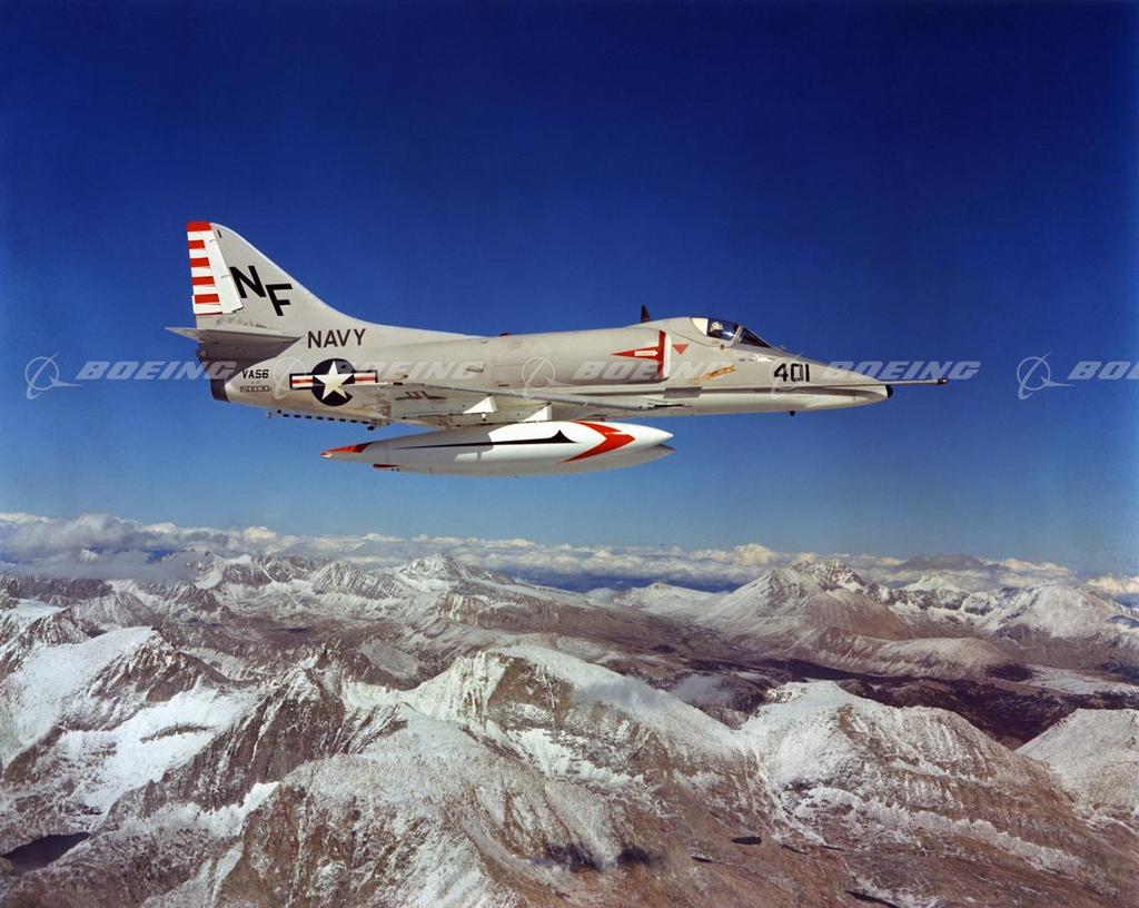The Douglas A4D Skyhawk was roughly half the empty weight of its contemporaries and could fly at 677 mph at sea level. After 1956, it had provisions for in-flight refueling, and it carried anti-radar missiles on its wing racks. After 1966, it included a hump-like avionics pod. Upgraded models had improved engines and a drogue parachute, new avionics displays, larger cockpit canopies, and more ammunition for the two cannons.