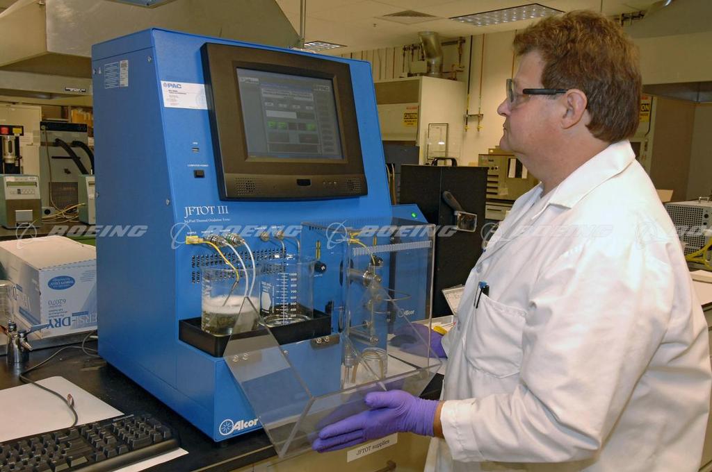 Boeing Lab Technician Tom Plank conducts fuel oxidation stability testing at the Boeing Commercial Airplanes Fuel and Lubricants Test Laboratory in Seattle, Wash. Boeing is exploring second-generation biofuel testing and processing methods to identify renewable alternative fuel sources for aviation uses as part of the company's environmental initiative.