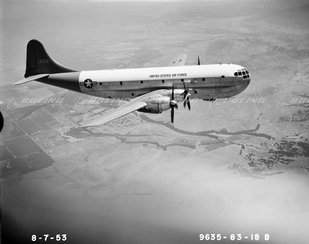 After the war Boeing developed the Model 367, a military transport based on the B-29 bomber. Its civilian counterpart was the Model 377 Stratocruiser. Cargo was loaded through large clamshell-type doors in the belly of the aircraft using a built-in ramp and a hoist. Its wings, engine gear and other parts were similar to the B-29.