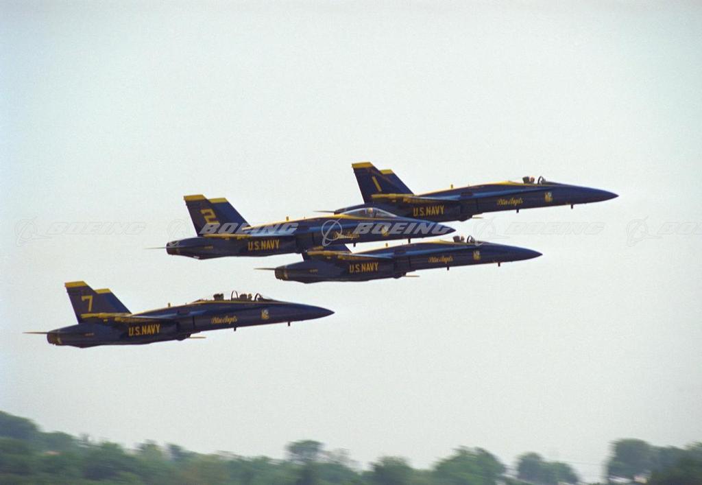 Blue Angels F/A-18A Hornet in a Diamond Flat Pass
