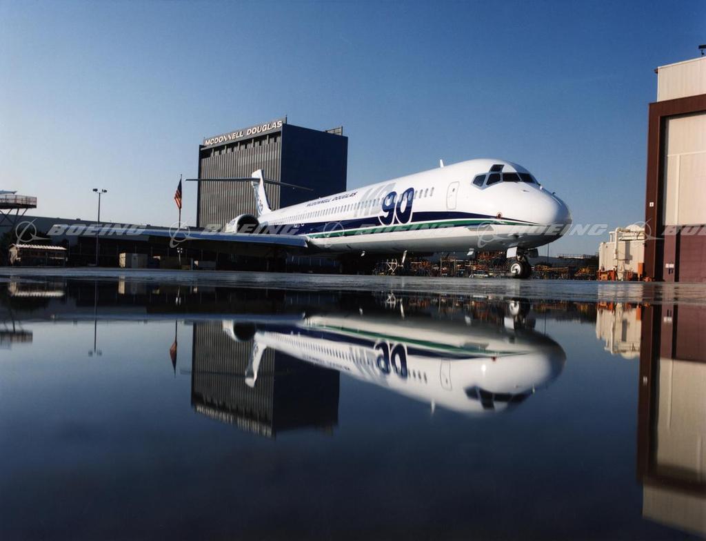 The McDonnell Douglas MD-90 twin jet displayed new corporate colors for the manufacturer's commercial aircraft division in the 1990s. The aircraft is pictured in front of the building that was the Long Beach, CA headquarters of the Douglas Aircraft division. The livery, featuring white, green and blue striping and lettering, was designed to emphasize the company's focus on environmental acceptability for its products. The MD-90's IAE V2500 engines made it the quietest, cleanest air transport in its class at the time this photo was taken in the mid 1990s.
