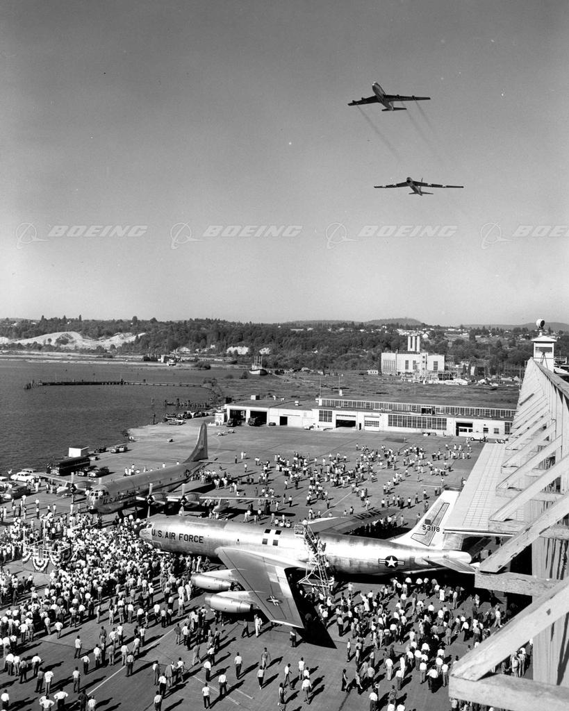 Dash 80 and B-52 Fly Over KC-135 Rollout, with KC-97 in Background