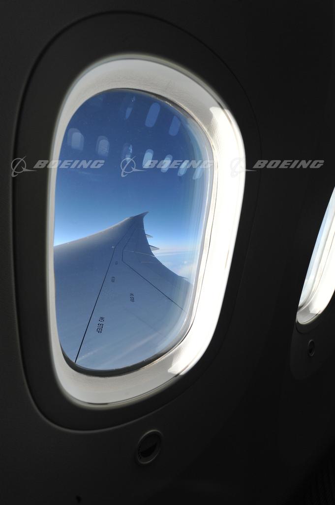 The 787 Dreamliner cabin windows feature electro-chromic shades and are the largest on any of today’s commercial airplanes, 70 percent larger than those on current aircraft of its size.