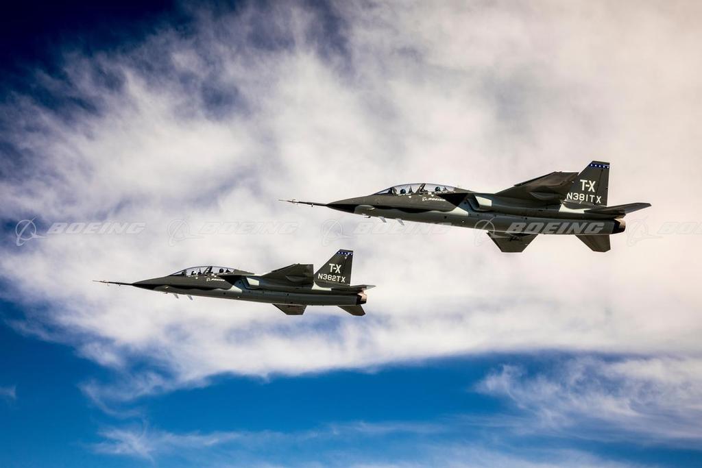 Two T-X aircraft in flight in St. Louis, Missouri in 2017. The first Boeing T-X trainer aircraft was revealed to the public in St. Louis on Tuesday, September 13th, 2016.