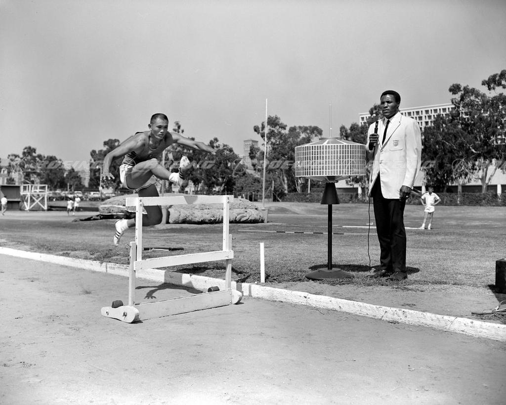 A model of Syncom 3, which was launched in August 1964. Like Olympians C.K. Yang (left) and Rafer Johnson, Syncom overcame high hurdles to succeed.