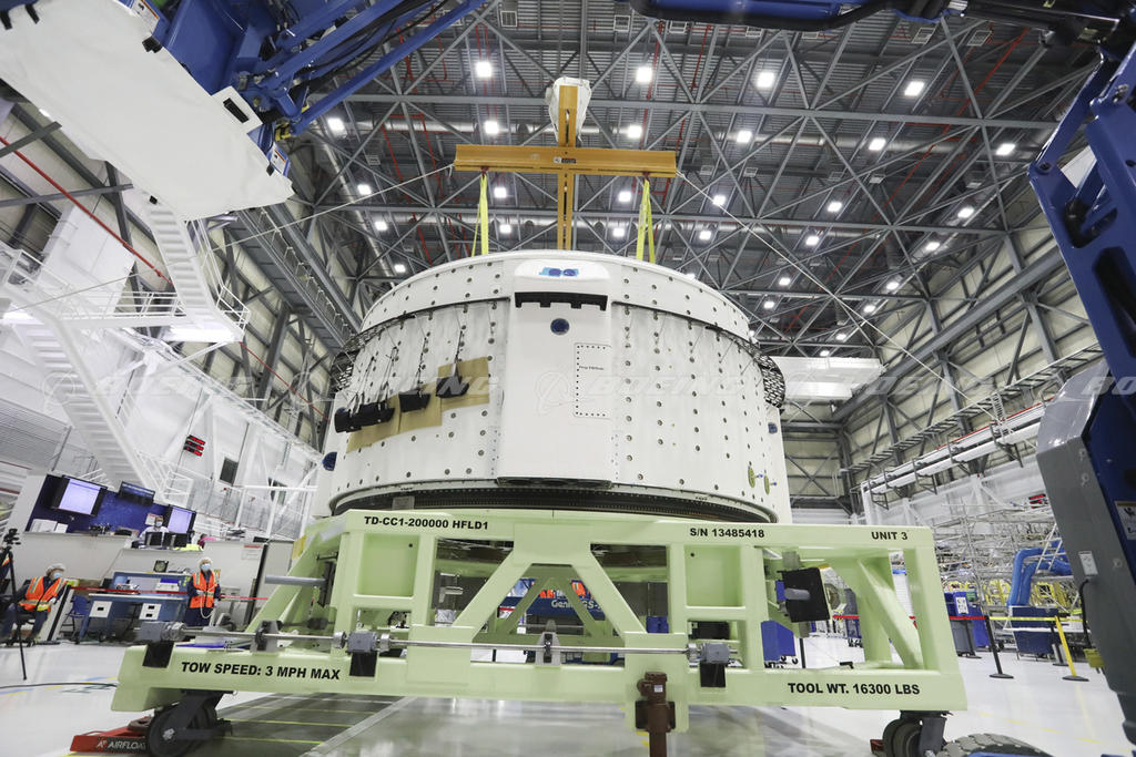 The completed Starliner service module for the Orbital Flight Test-2 mission prepares to be weighed inside the Starliner production factory at Kennedy Space Center in Florida.
