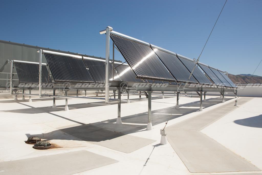 To receive the LEED Silver certification, the building was designed to include numerous large windows, which are not commonly used in paint facilities; a rainwater collection system; recycled and salvaged building materials and enhanced environmental controls. But what makes the building stand out are the 3,600 rooftop solar tubes that provide heating for a portion of the paint operations. This addition also makes it the first Boeing paint facility to be partially heated by solar energy. Located on the roof of the building, thousands of solar tubes collect energy from the sun, which is used to heat water that is piped to the curing process.