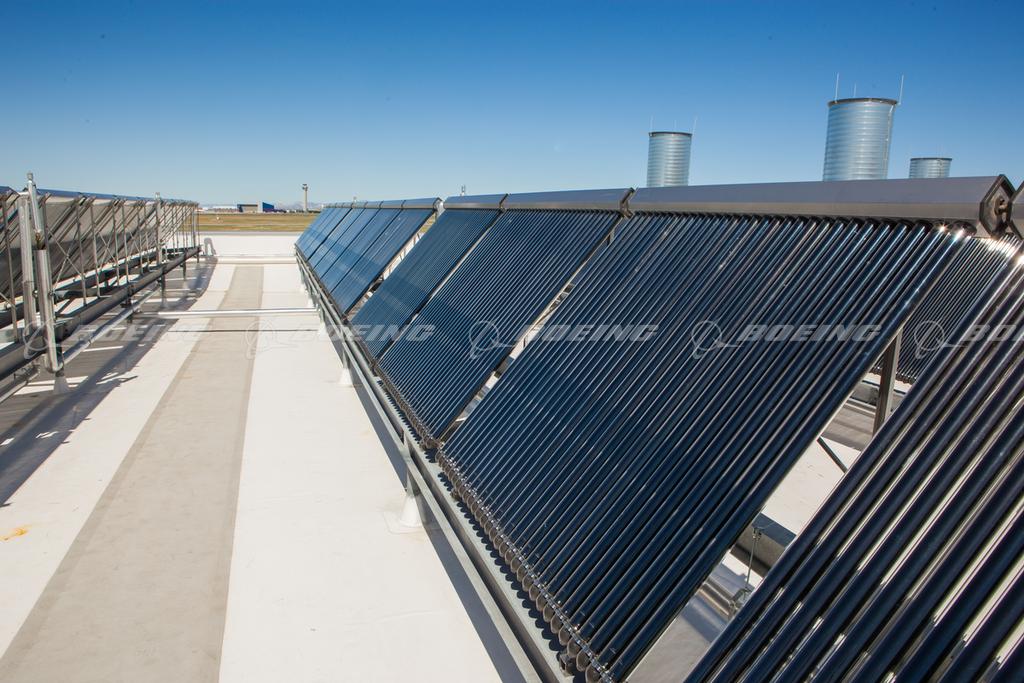 To receive the LEED Silver certification, the building was designed to include numerous large windows, which are not commonly used in paint facilities; a rainwater collection system; recycled and salvaged building materials and enhanced environmental controls. But what makes the building stand out are the 3,600 rooftop solar tubes that provide heating for a portion of the paint operations. This addition also makes it the first Boeing paint facility to be partially heated by solar energy. Located on the roof of the building, thousands of solar tubes collect energy from the sun, which is used to heat water that is piped to the curing process.