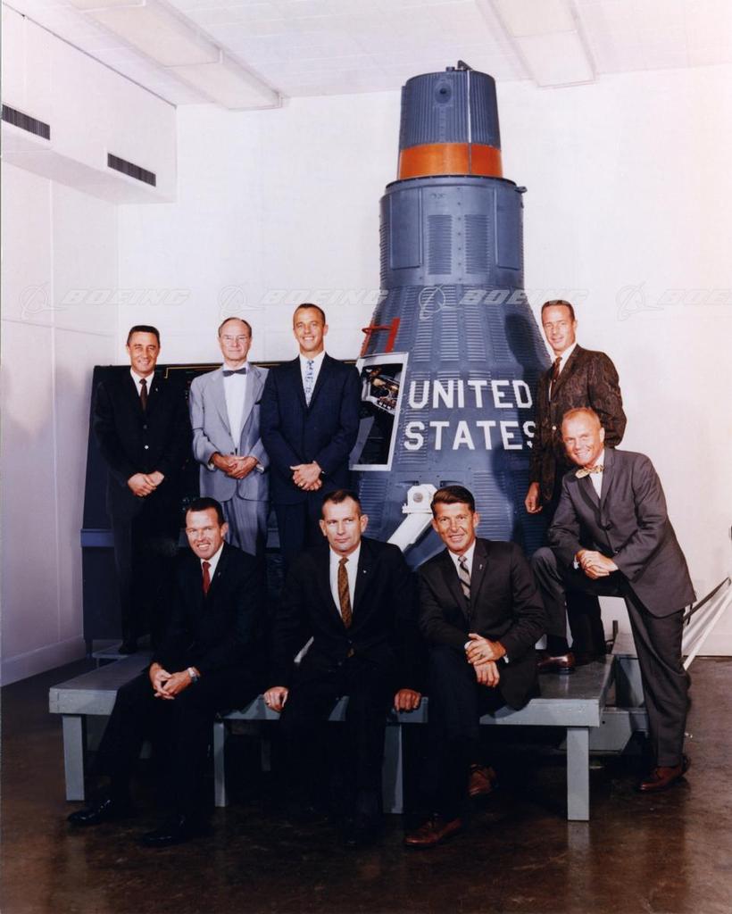 The seven original American astronauts were Alan B. Shepard, Virgil I. (Gus) Grissom, John H. Glenn, M. Scott Carpenter, Walter M. Wally) Schirra, L. Gordon Cooper, and Donald K. (Deke) Slayton. NASA introduced the astronauts in Washington DC on 9 April 1959. Sometimes known as the Mercury Seven, or the Seven Original Astronauts, they piloted the manned spaceflights of the Mercury program from May 1961 to May 1963. Three of the astronauts were Air Force pilots (Grissom, Cooper, and Slayton); three were Navy pilots (Shepard, Carpenter, and Schirra), and one was a Marine Corps pilot (Glenn).