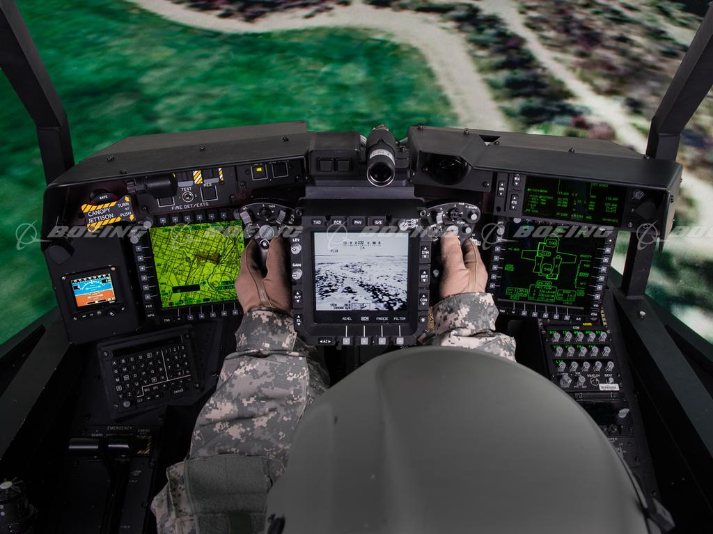 AH-64E co-pilots crew station in the flight simulator. View shows co-pilots view of instrumentation and out window.