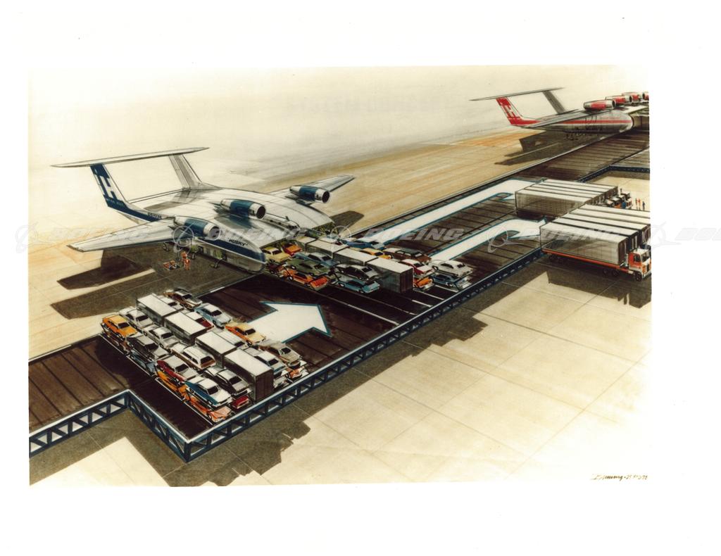 The Boeing Model 754 was an uncompromised all-cargo transport concept to revolutionize the air freight industry. The aircraft was 162 feet long with a 210 foot wingspan and nearly 33,000 cubic feet of cargo space. The three-engine version was meant for short to medium routes, a four-engine version would have handled long range flights and military airlift missions.
