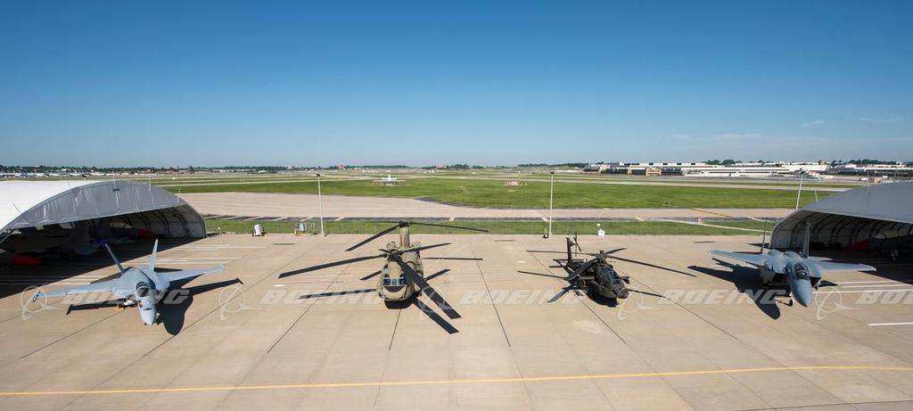 F/A-18s and F-15s on the flight ramp at the St. Louis jet fighter factory were joined by visiting Apache and Chinook helicopters in June 2015, offering a rare opportunity to capture four of Boeing's defense products in one image. The Chinook is built in Philadelphia and the Apache in Mesa.