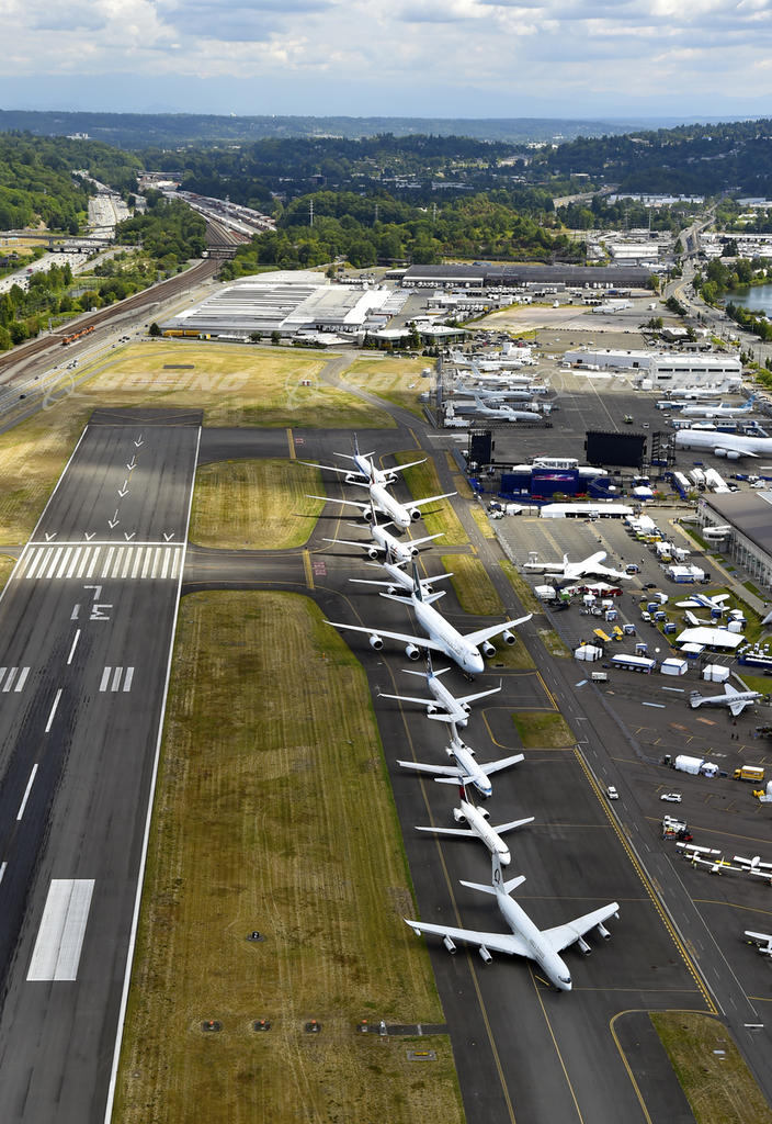 Seven (7) Series from Air; 707; 717; 727; 737; 747; 757; 767; 777-300-ER; 787; Omega; Delta; United; Alaska; Cathay pacific; FedEx; Emirates; ANA; Museum of Flight; Boeing field; 2016-07-16; View from North; K66565-36