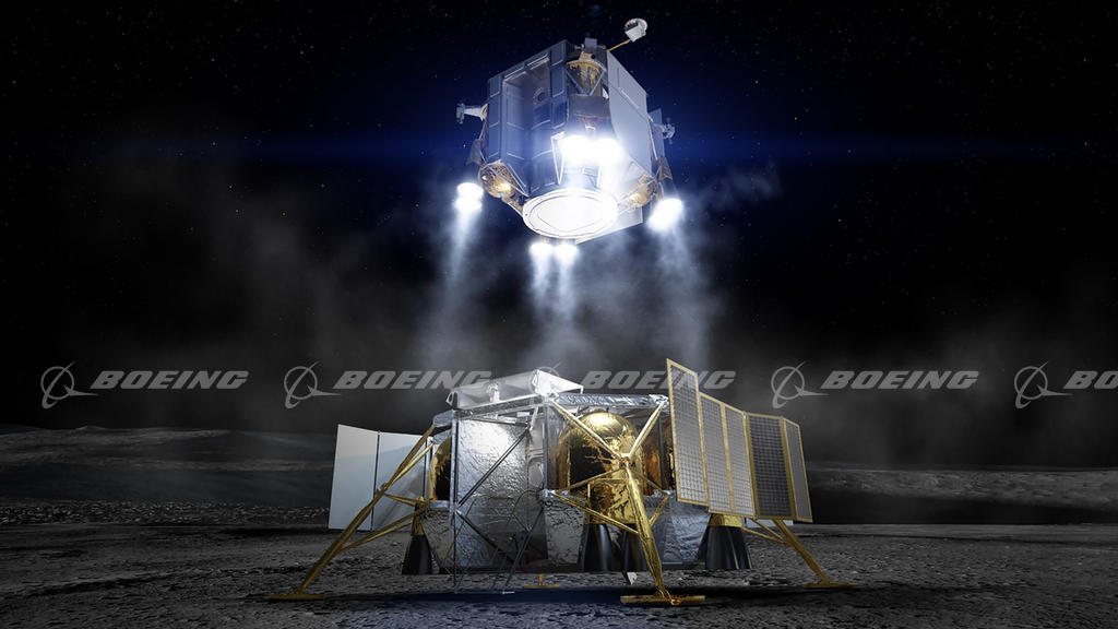 Following exploration of the lunar surface by astronauts, the crew lifts off from the moon inside the ascent element in this artist's concept. The descent element remains on the moon having already performed its role of flying the crew from lunar orbit to the surface. (Boeing image)
