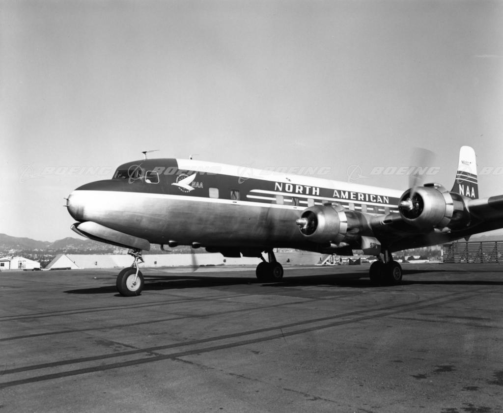 One-half left front view of North American Air Lines Douglas DC-6B (r/n N6120C) on the ground with engines running. Boeing (McDonnell Douglas photo).