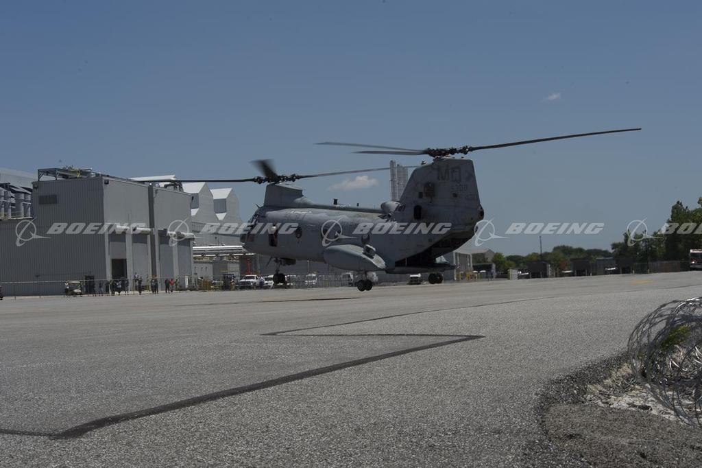 One of the last CH-46s in service with the U.S. Marine Corps lands at Boeing’s Philadelphia site.