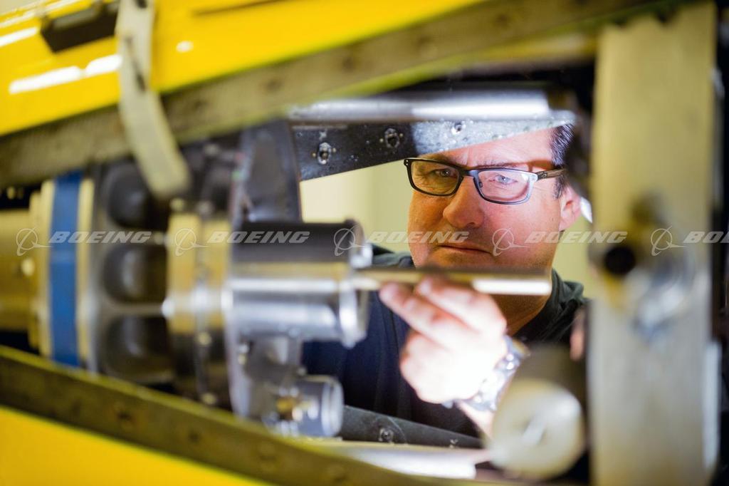 In this photo Steve Dombkowski, Boeing field mechanical lead, checks the oil level in Echo Seeker’s main propulsion motor compensator.
