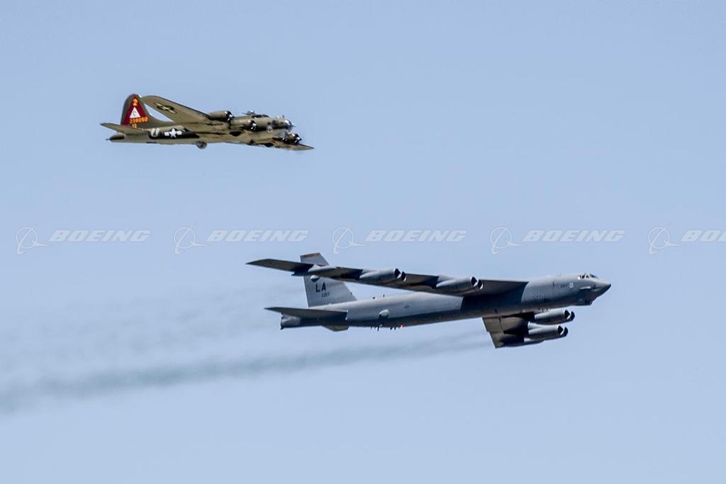 Two legendary Boeing bombers, a B-17G Flying Fortress and a B-52H Stratofortress, in flight over Barksdale AFB, Louisiana. The B-17 served with distinction in World War II. The B-52 is the longest-serving bomber in US military history.
