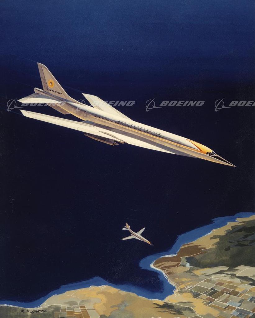 The Model 733, illustrated by Boeing illustrator Ralph McQuarrie, was the early version of the Boeing Supersonic Transport or SST. The sleek design featured the efficient variable-sweep wing, shown here in the supersonic position with its wings swept sharply back into the classic "arrow" form, and with wings in the swept forward position for better handling at lower speeds. The design followed more than eight years of continuous research on large supersonic transport types and was evolved from some 500 designs studied as the best suitable for transport needs in the 1970's. Principal structure was to be of titanium. The Boeing 733 could have carried from 150-227 passengers and be capable of nonstop flights of more than 4,000 miles (6400 km).