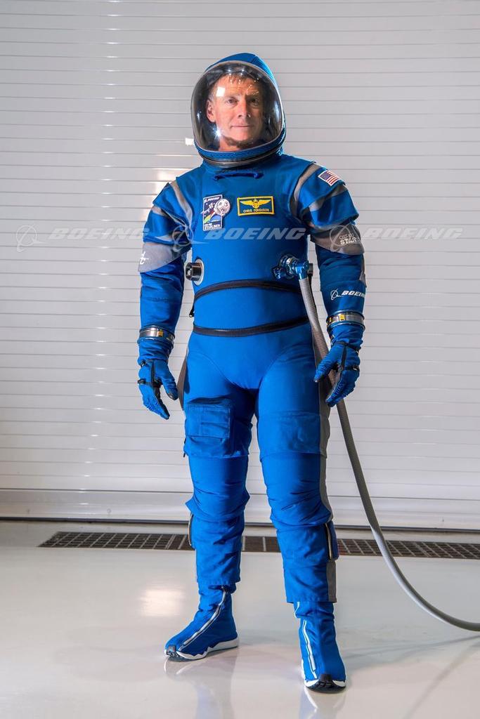 Chris Ferguson, Boeing director of Starliner Crew and Mission Systems, is shown wearing the Starliner spacesuit. The Starliner spacesuit provides greater pressurized mobility and is about 40 percent lighter than previous suits. Its innovative layers will keep astronauts cooler as well. The touchscreen-friendly gloves allow astronauts to interact with the capsule’s tablets while the boots are breathable and slip resistant. Zippers in the torso area will make it easier for astronauts to comfortably transition from sitting to standing. In addition to protecting astronauts during launch and the return to Earth, the suit also helps connect astronauts to ground and space crews through the communications headset within the helmet. The suit’s hood-like soft helmet sports a wide polycarbonate visor to give Starliner passengers better peripheral vision throughout their ride to and from space.