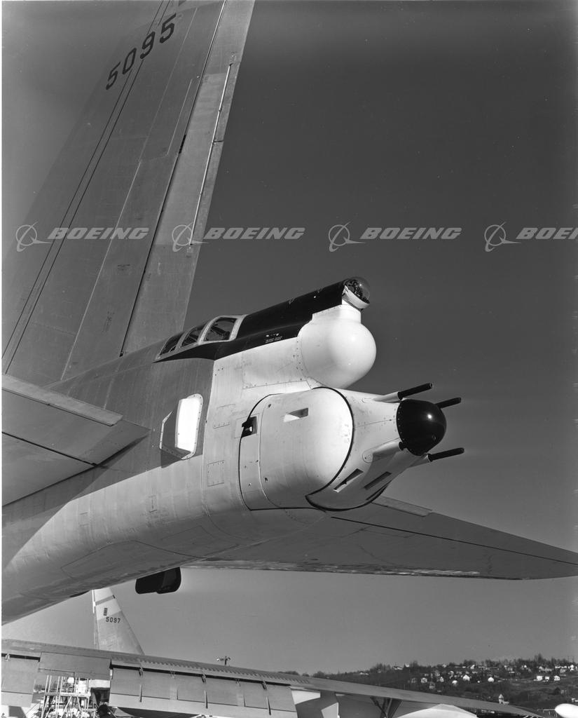 Tailgunner position on B-52D Stratofortress parked at Renton Site. The eight-engine, 390,000-pound B-52 was the country's first long-range, swept-wing heavy bomber. It began as an intercontinental, high-altitude nuclear bomber, and its operational capabilities were adapted to meet changing defense needs.