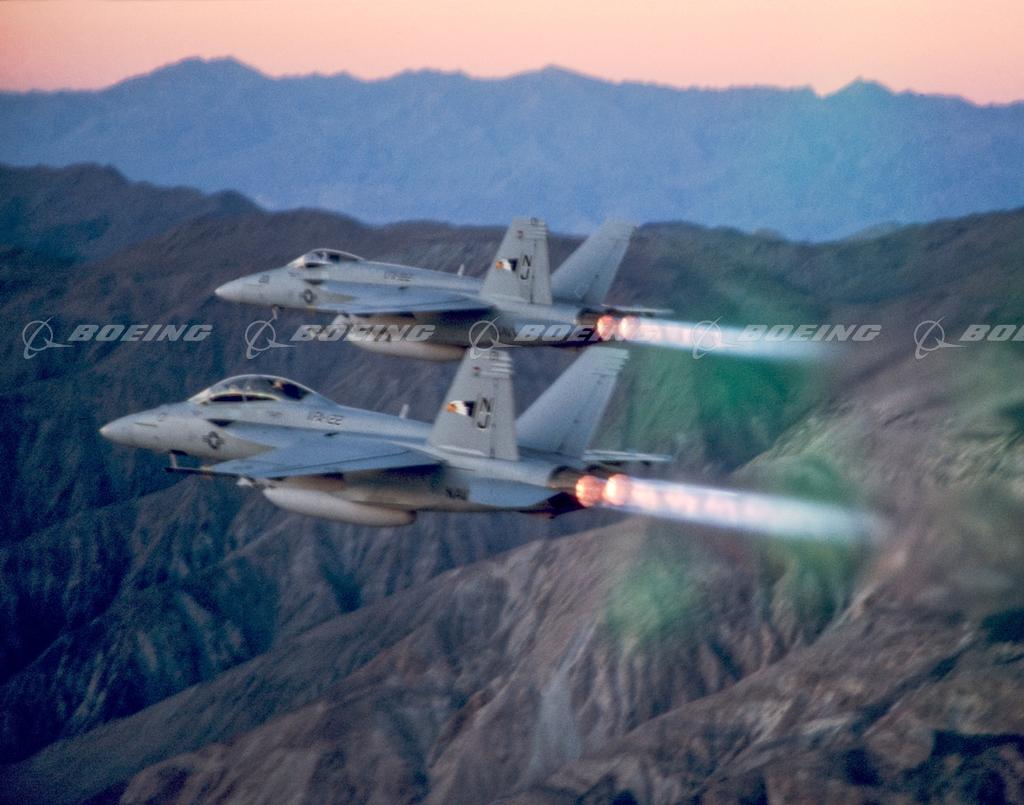 F/A-18 E/F Super Hornet in Flight Afterburners Glowing in Sunset