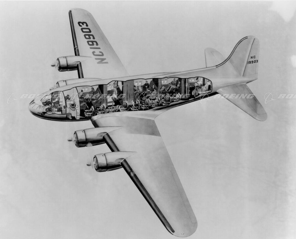 The Boeing Model 307 Stratoliner was the world's first high-altitude commercial transport and the first four-engine airliner in scheduled domestic service. The Stratoliner was the first airplane to have a flight engineer as a member of the crew. The engineer was responsible for maintaining power settings, pressurization and other subsystems, leaving the pilot free to concentrate on other aspects of flying the aircraft. The Boeing Model 307 circular fuselage provided maximum space for the five crew members and 33 passengers. The nearly 12-foot-wide cabin had space for comfortable berths for overnight travelers.