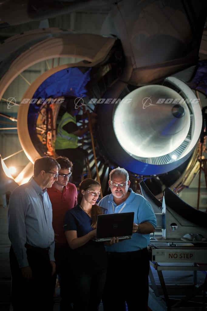In late 2014, The Boeing ecoDemonstrator 787 began flight testing more than 25 new technologies aimed at improving aviation's environmental performance through every phase of flight. The Boeing ecoDemonstrator Program accelerated the testing, refinement and use of new technologies and methods that can improve efficiency and reduce noise. This new round of testing, using 787 Dreamliner ZA004, evaluated software and connectivity technologies related to operational efficiency; remote sensors to reduce wiring; aerodynamic and flight control improvements for greater fuel efficiency, and icephobic wing coatings to reduce ice accumulation. Boeing is the only major airplane manufacturer with a test plane dedicated exclusively to evaluating environmentally progressive technologies. From left, Bill Keith, T Pinney, Leanne Lehman, and Craig Frankel.